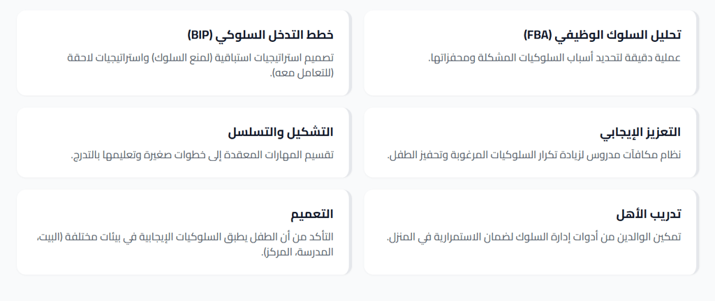 يتضمن برنامجنا تحليل البيئة المحيطة بالطفل، وتحديد المحفزات التي تسبق السلوك والعواقب التي تليه. نعمل على استبدال السلوكيات غير التكيفية (مثل الصراخ، العدوانية، إيذاء الذات) بمهارات بديلة تؤدي نفس الوظيفة ولكن بطريقة مقبولة اجتماعياً. هدفنا هو مساعدة الطفل على التنظيم الذاتي والاندماج في المجتمع بفعالية.