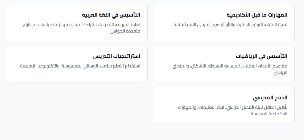برنامجنا لا يقتصر فقط على تعليم القراءة والكتابة، بل يشمل تطوير المهارات النمائية التي تسبق التعلم الأكاديمي، مثل الانتباه، والذاكرة، والإدراك البصري والسمعي. نستخدم استراتيجيات تعليمية حديثة ومبتكرة تجعل من التعلم تجربة ممتعة ومحفزة، مع التركيز على دمج الأطفال في البيئة المدرسية بسلاسة وثقة.